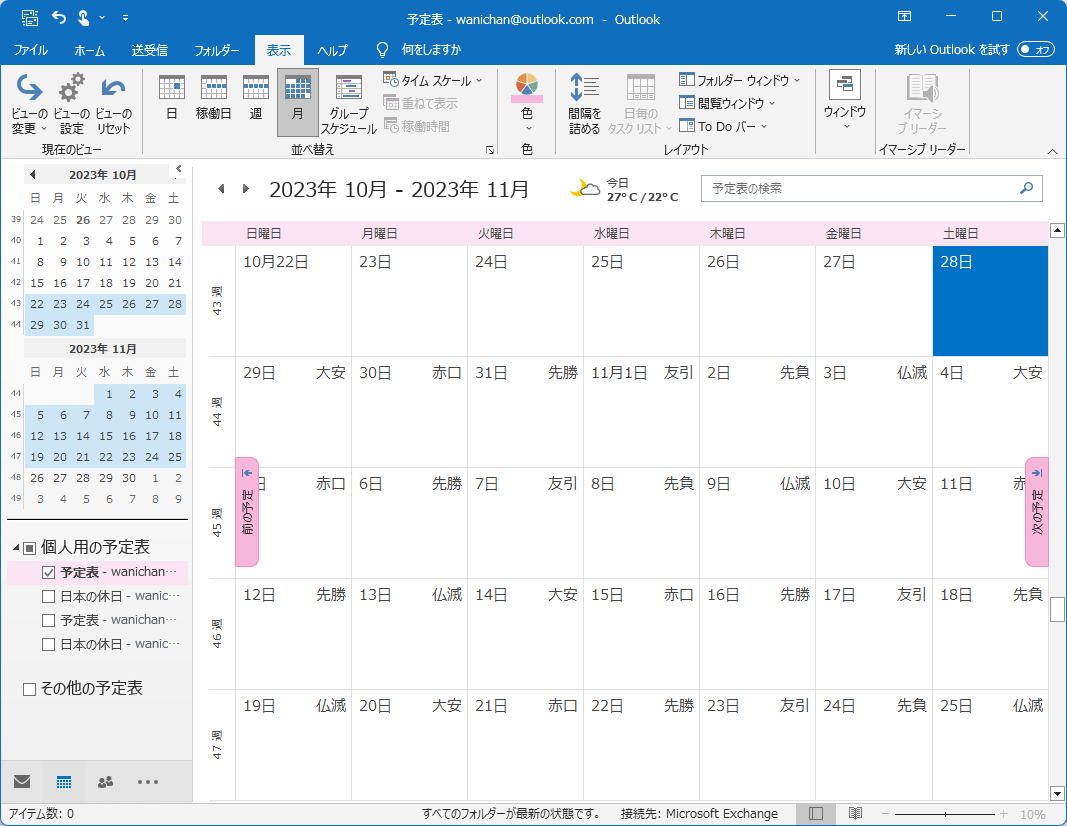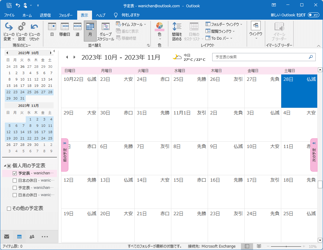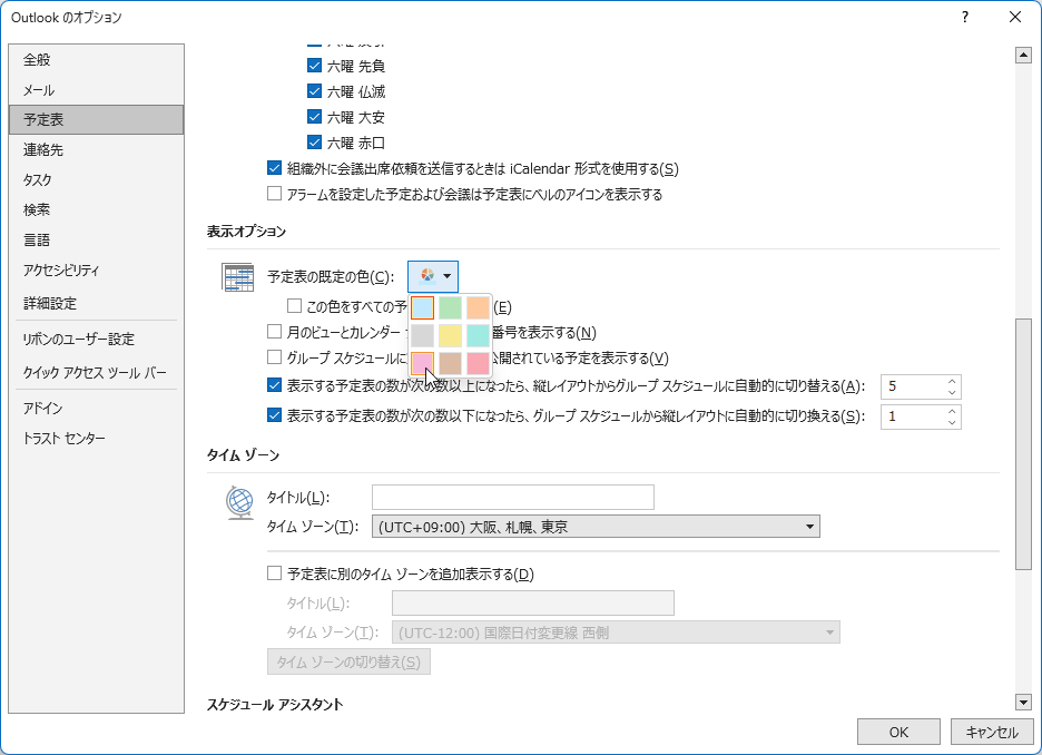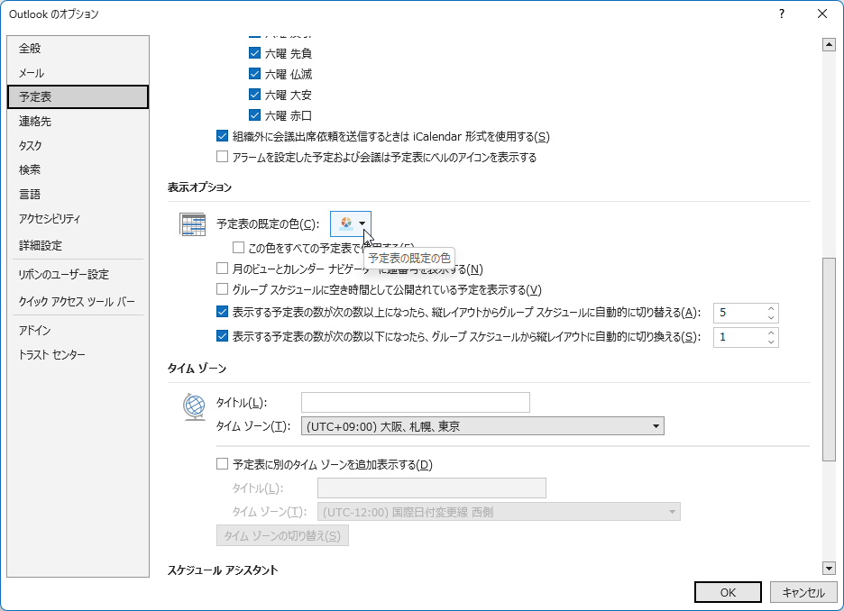 - [表示オプション]の[予定表の既定の色]から色を選択して[OK]ボタンをクリックします。