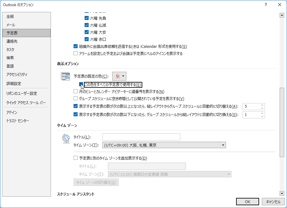 - Outlookのオプションの[表示オプション]にて、[この色のすべての予定表で使用する]にチェックを入れます。