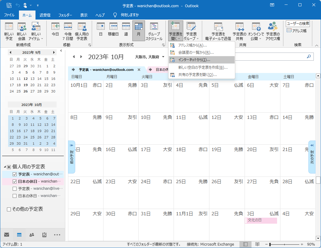 インターネット上のICSのアドレスを利用してOutlookにそのカレンダーを表示することができます。[ホーム]タブを開き、[予定表の管理]グループから[予定表を開く]をクリックして、[インターネットから]を選択し、インターネット上のアドレスを入力します。ここでは、Googleカレンダーの日本の祝日を開く方法について説明します。