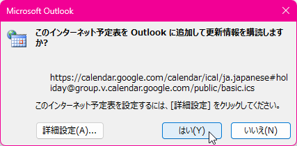 - 「このインターネット予定表をOutlookに追加して更新情報を購読しますか?」というメッセージが表示されたら[はい]ボタンをクリックします。