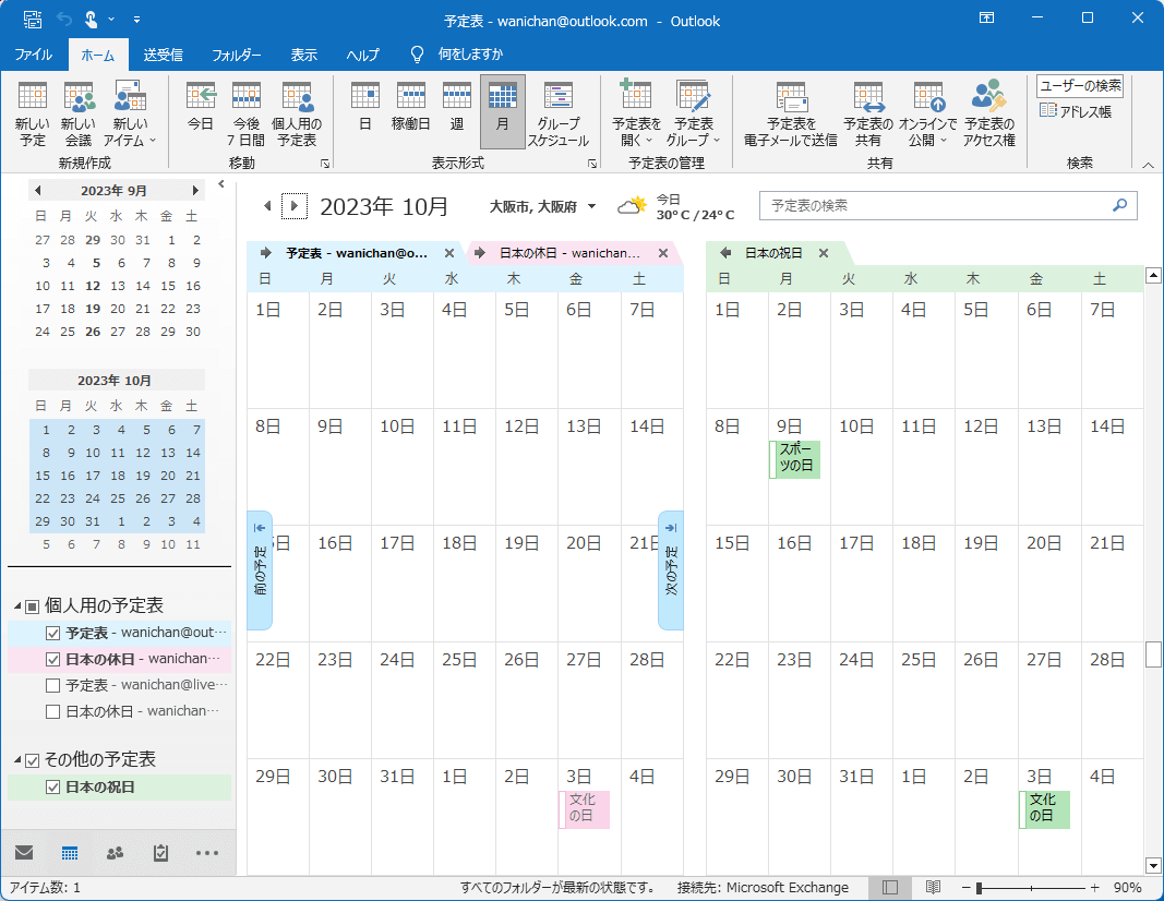 - [ホーム]タブを開き、[予定表の管理]グループから[予定表を開く]をクリックします。