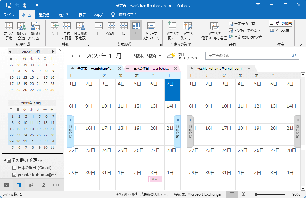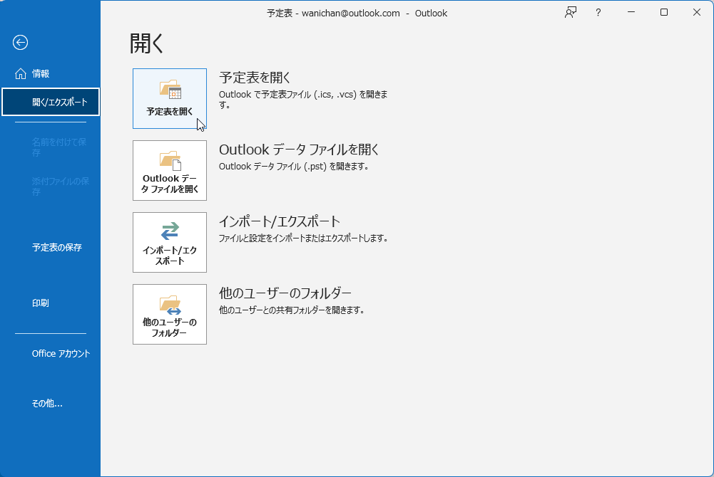- [ファイル]タブから[開く/エクスポート]を開き、[予定表を開く]ボタンをクリックします。