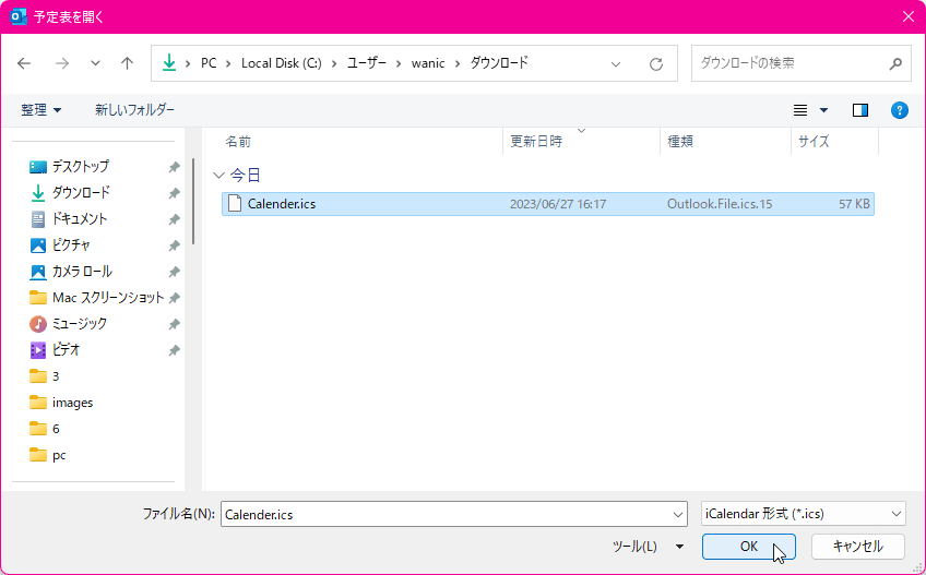 - ICSファイルを選択して[開く]ボタンをクリックします。