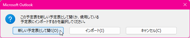 - 以下の画面が表示されたら[新しい予定表として開く]をクリックします。