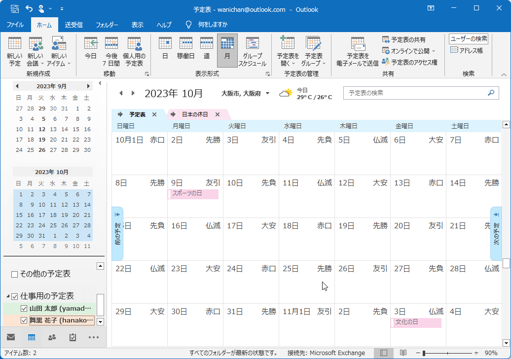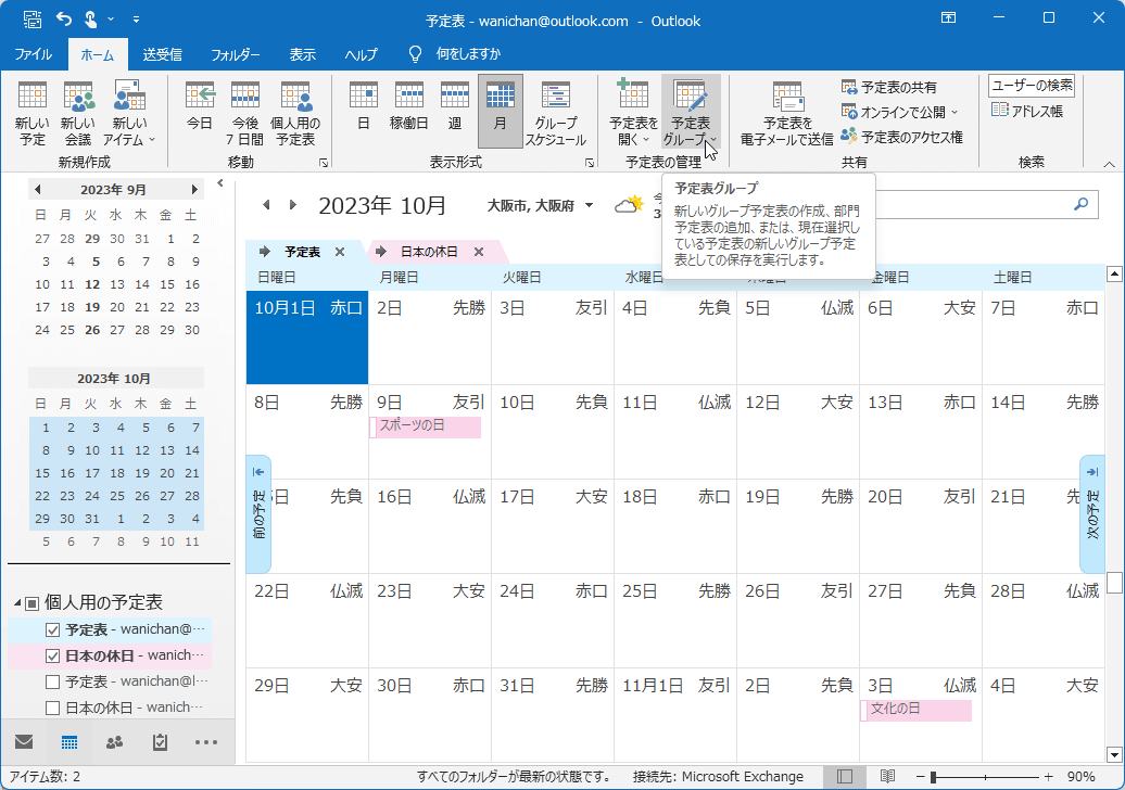 - [ホーム]タブを開き、[予定表の管理]グループの[予定表グループ]をクリックします。
