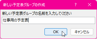 - [新しい予定表グループの作成]ダイアログボックスで、新しい予定表グループの名前を入力して[OK]ボタンをクリックします。