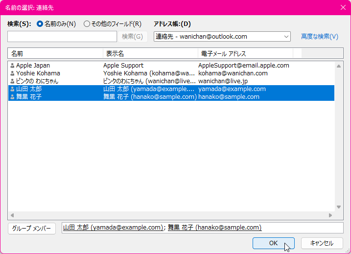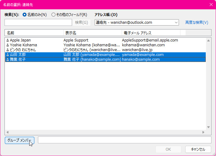 - Microsoft Exchangeサーバーの場合、連絡先からメンバーを選択できます。ただし、それ以外の環境の場合は[キャンセル]ボタンをクリックします。[キャンセル]ボタンをクリックすることで、空の予定表グループが生成されます。
