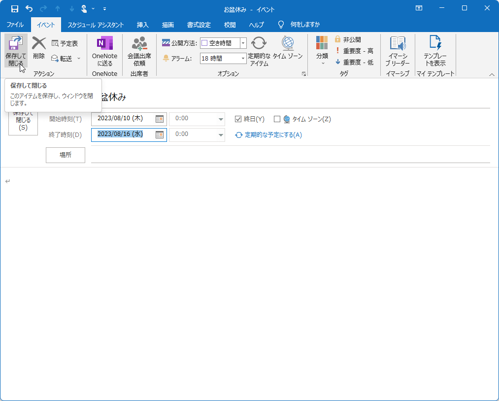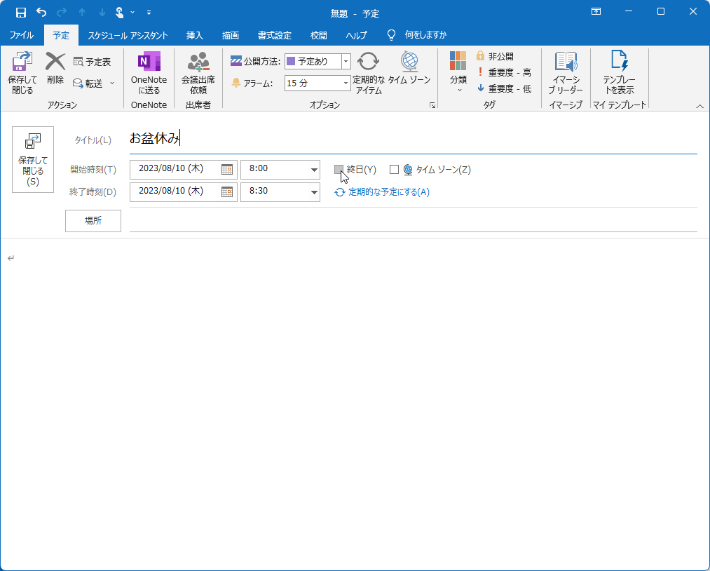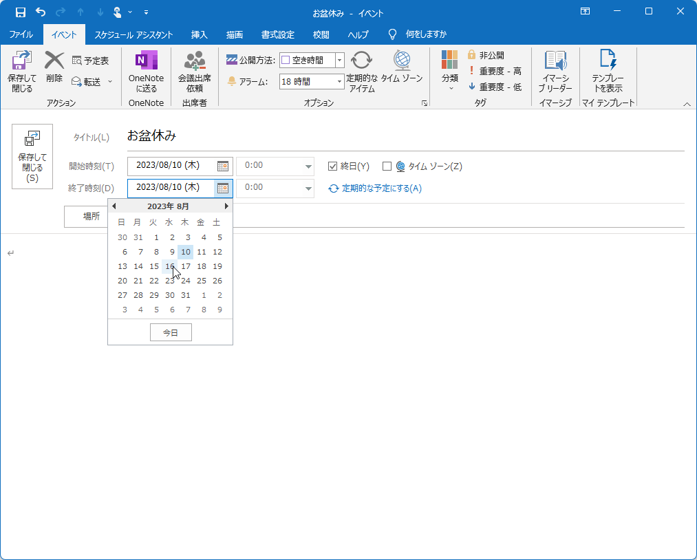 たとえば、8月10日から16日までお盆休みの場合、終日のチェックを付けて、開始時刻ボックスの日付に8月10日、終了時刻の日付に8月16日を指定します。