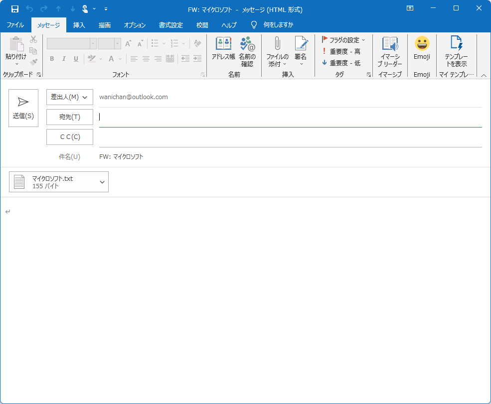 - vCard(テキストファイル形式)で添付された新しい転送メッセージが作成されました。
