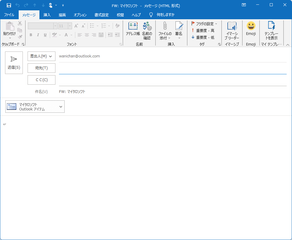 - Outlookアドレス帳の連絡際グループが添付された新しい転送メッセージが作成されました。
