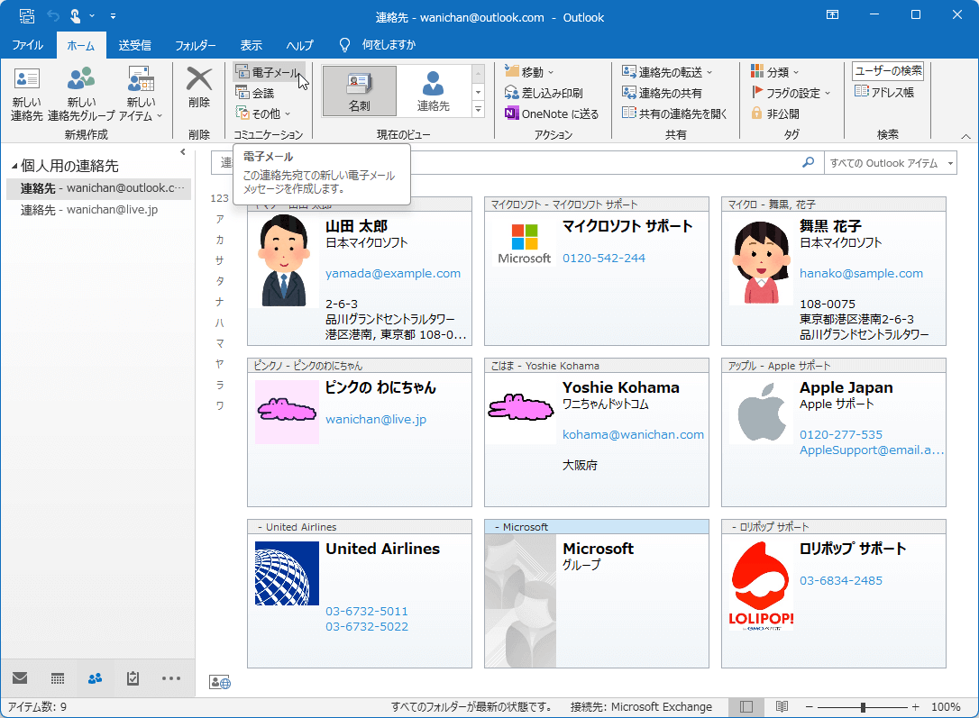 - 連絡先グループを選択して[ホーム]タブの[コミュニケーション]グループの[電子メール]を選択します。