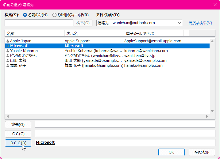 - 連絡先グループを選択して[BCC]ボタンをクリックし、[OK]ボタンをクリックします。