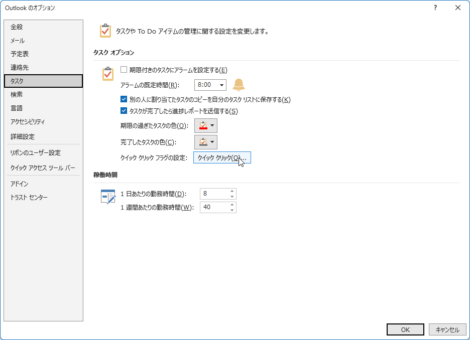 フラグ列をクリックしたとき、既定では今日のフラグが設定されています。必要に応じて、明日、今週、来週、日付、完了に変更できます。Outlookのオプションの[タスク]タブを開き、[タスク オプション]の[クイッククリック]ボタンより設定できます。