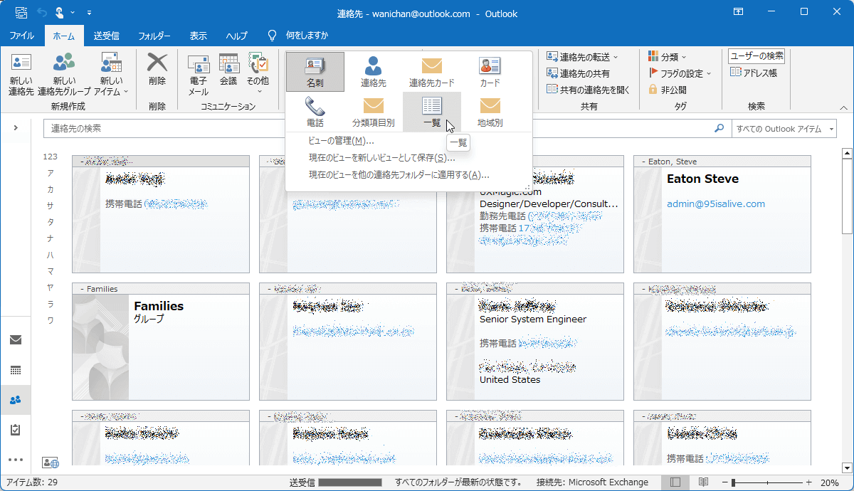連絡先のビューを変更するには[ホーム]タブを開き、[現在のビュー]グループから目的のビューを選択します。ビューの詳細設定を使用して、現在のビューをカスタマイズするには、[表示]タブを開き、[現在のビュー]グループの[ビューの設定]をクリックして[ビューの詳細設定]ダイアログボックスを開きます。