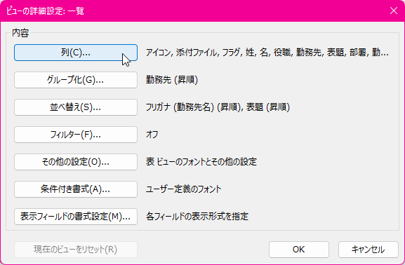 - [ビューの詳細設定]ダイアログボックスの[列]ボタンをクリックします。