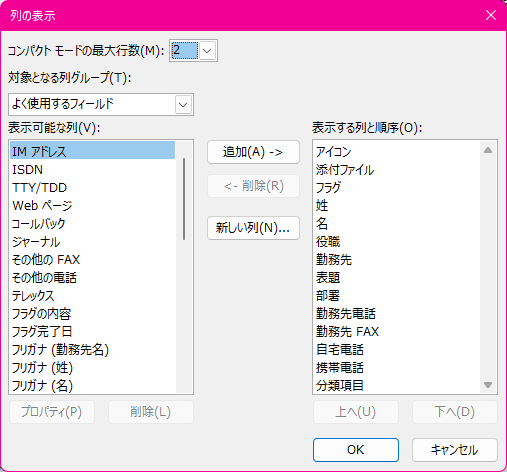 - [列の表示]ダイアログボックスにて、列の追加と削除、および順序の変更が行えます。