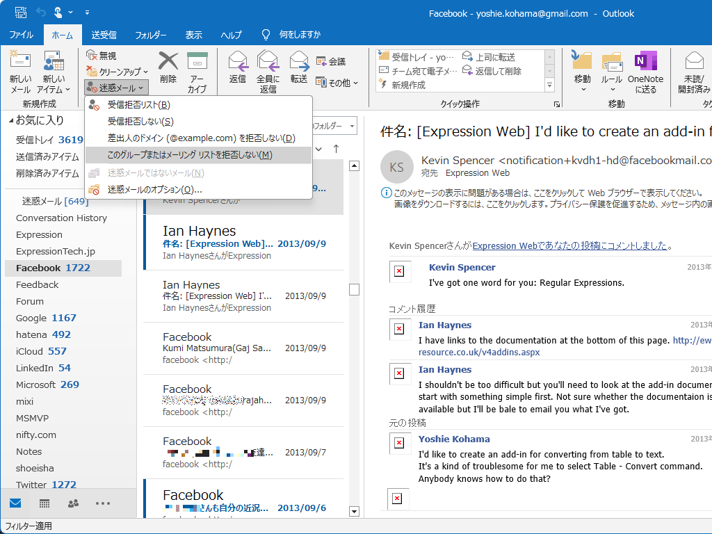 該当するメッセージを選択し、[ホーム]タブの[削除]グループにある[このグループまたはメーリングリストを拒否しない]を選択し、拒否したくない電子メールアドレスを指定することによって、セーフリストに追加されます。