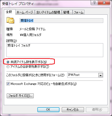 - [受信トレイ プロパティ]の[全般]タブが開いたら、[未読アイテム数を表示する]を選択して[OK]ボタンをクリックします。