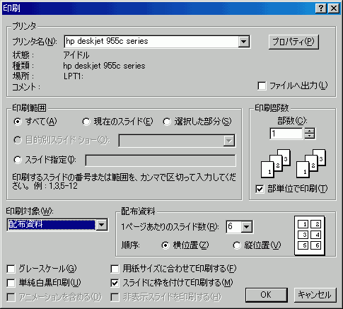 - 印刷ダイアログボックスの「印刷対象」を「配布資料」に設定して、