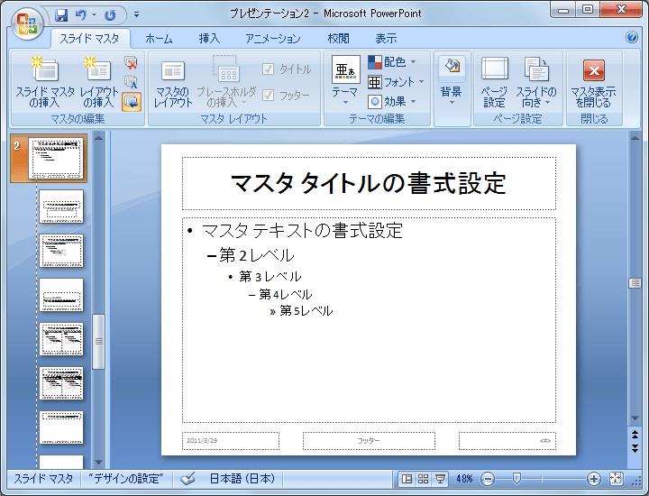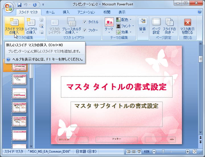 - [スライドマスタ]タブの[スライドマスタの挿入]ボタンをクリックします。