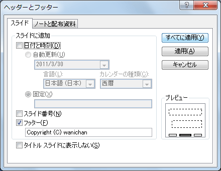 - [ヘッダーとフッター]ダイアログボックスの[フッター]にチェックを付けます。