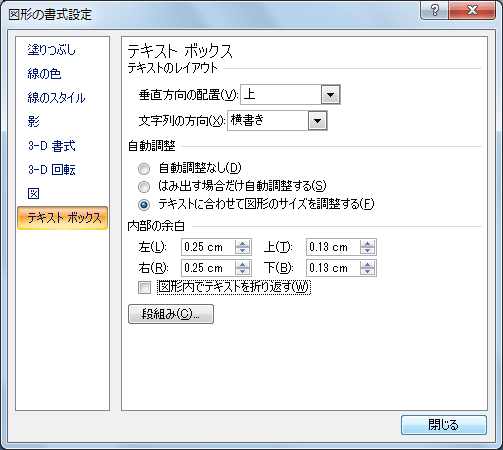 - [図形の書式設定]ダイアログボックスの左側のカテゴリから[テキストボックス]をクリックすると、テキストボックスのレイアウトや自動調整、内部の余白などの書式設定画面が表示されます。