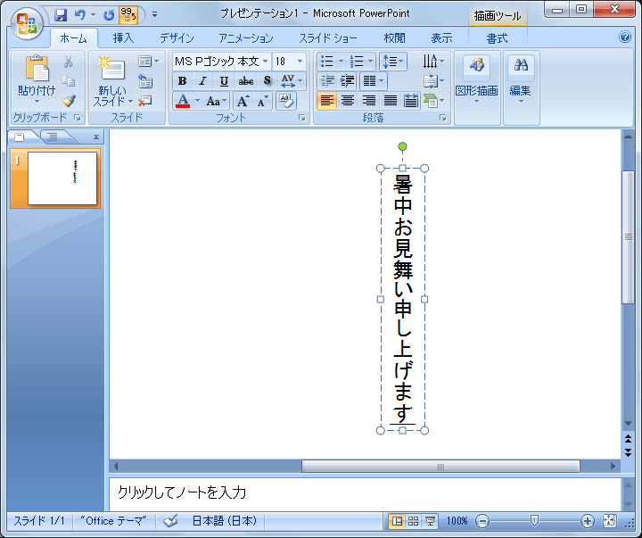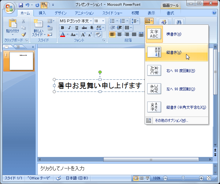 PowerPoint 2007で縦書きや横書きなど、文字の方向を変更するには、[ホーム]タブの[文字列の方向]ボタンをクリックして、任意の方向を選択するか、[図形の書式設定]を表示して、[テキストボックス]カテゴリの中で操作します。