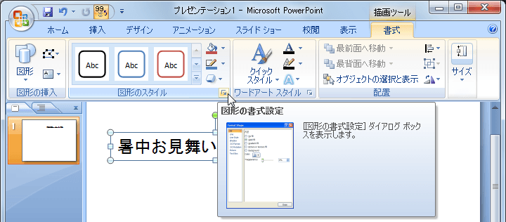 - [書式]タブを開き、[図形のスタイル]右下の[図形の書式設定]をクリックします。
