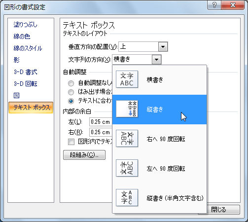 - [図形の書式設定]ダイアログボックスの[テキストボックス]カテゴリを開き、[文字列の方向]ボックス一覧から文字の方向を選択します。