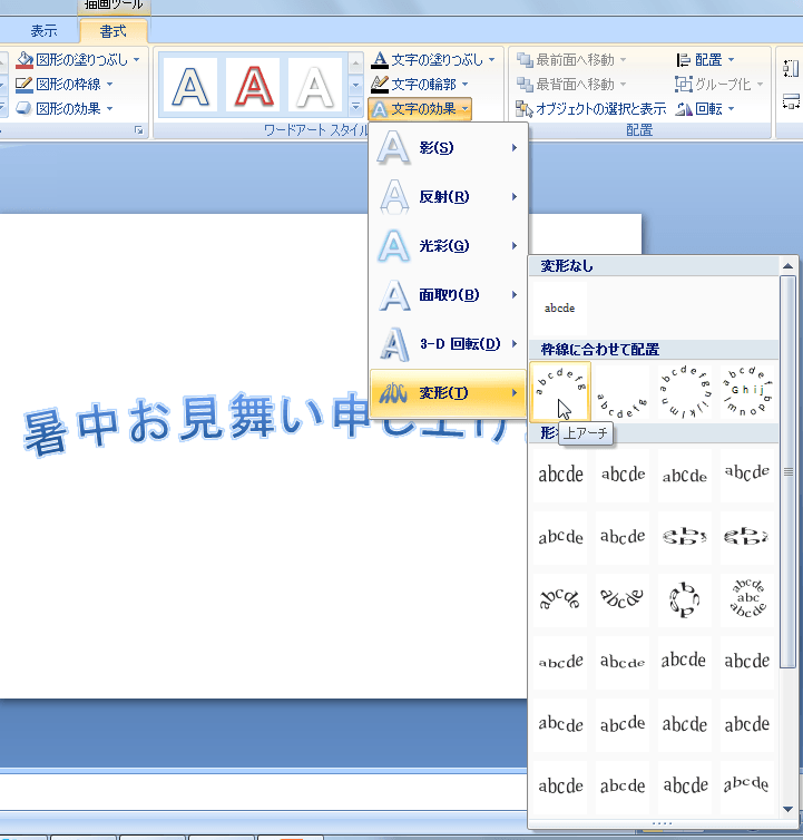 - [文字の効果]をクリックし、[変形]をポイントして、一覧から変形の形状を選択します。