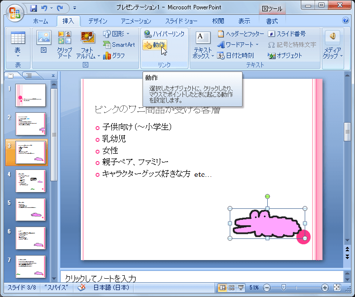 - 対象となるオブジェクトを選択して、[挿入]タブの[リンク]の[動作]をクリックします。