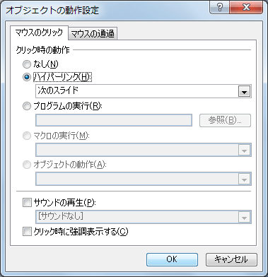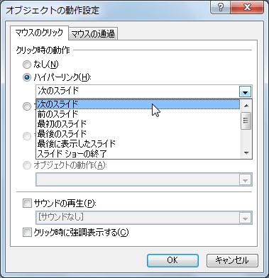 PowerPoint 2007の[オブジェクトの動作設定]ダイアログボックスで、マウスのクリックまたは通過時に「次のスライド」「前のスライド」「最初のスライド」「最後のスライド」「最後に表示したスライド」「スライドショーの終了」イベントを設定できます。