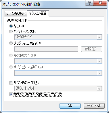 - [オブジェクトの書式設定]ダイアログボックスの[マウスの通過]タブを開きます。