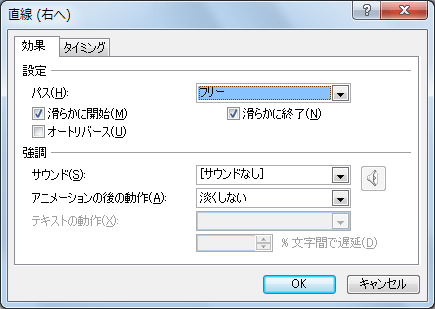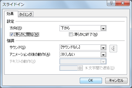- [スライドイン]ダイアログボックスの[効果]タブが開かれるので、[設定]オプションの[滑らかに開始]や[滑らかに終了]のいずれか、または両方をチェックをして、[OK]ボタンをクリックします。ただし、アニメーションの種類によっては、有効でない場合があるので注意してください。例えば、[開始]に分類されたアニメーションにおいて、[滑らかに終了]しても効果は得られません。