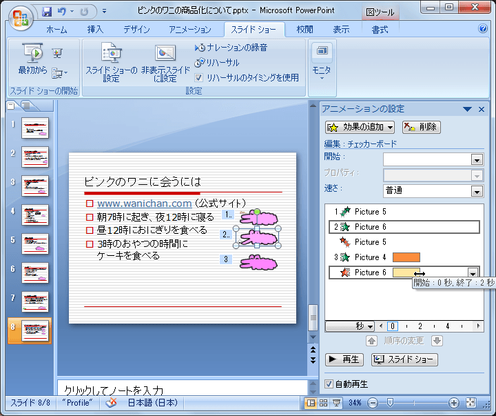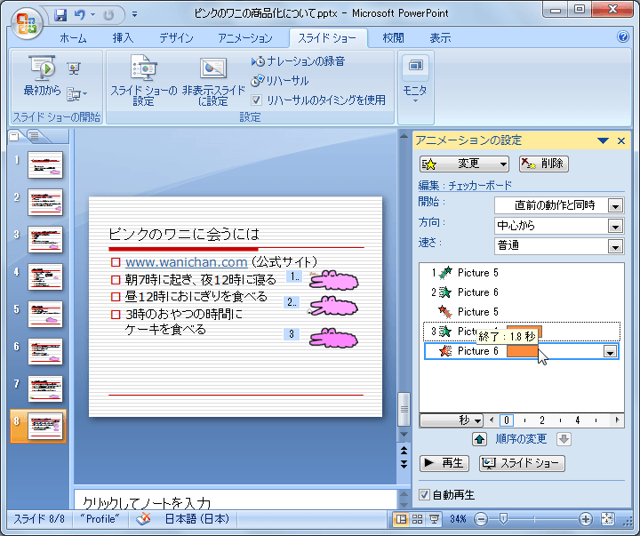 PowerPoint 2007でアニメーションの設定作業ウィンドウで時間配分を表示すると、マウス操作で簡単に時間を調整できます。