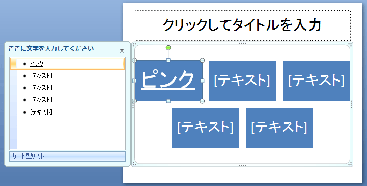 SmartArtグラフィックのプレースホルダの左側の辺をクリックすることで、テキストウィンドウが表示されます。
