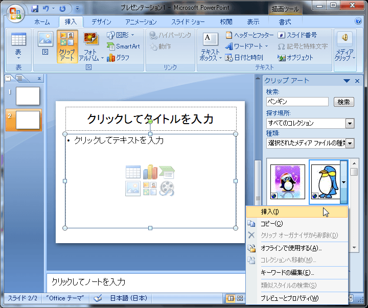 コンテンツのプレースホルダにクリップアートを挿入すると