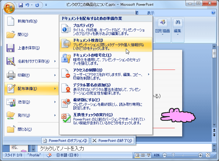 ほかの人にプレゼンテーションファイルを配布する前に、あらかじめコメントと注釈、ドキュメントのプロパティ(作成者の情報などの個人情報)を削除しておきたい場合があると思います。この場合は、ドキュメント検査機能を利用するとよいでしょう。