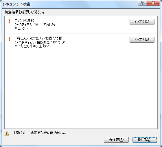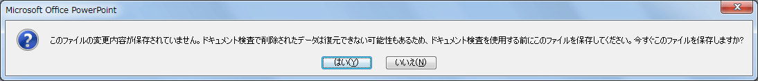 - [このファイルの変更内容が保存されていません。ドキュメント検査で削除されたデータは復元できない可能性があるため、ドキュメント検査を使用する前にこのファイルを保存してください。今すぐこのファイルを保存しますか?]と表示されたら[はい]ボタンをクリックします。