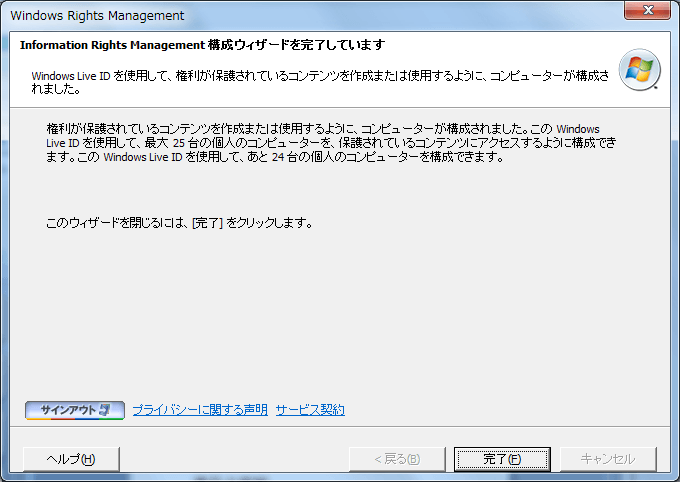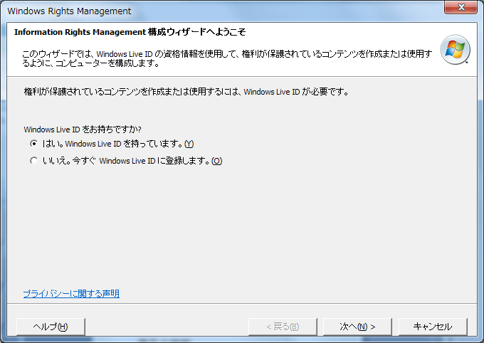 - Information Rights Management構成ウィザードへようこそ画面が表示されたら、Windows Live IDを持っている場合は[はい。Windows Live IDを持っています。」を選択して[次へ]ボタンをクリックします。