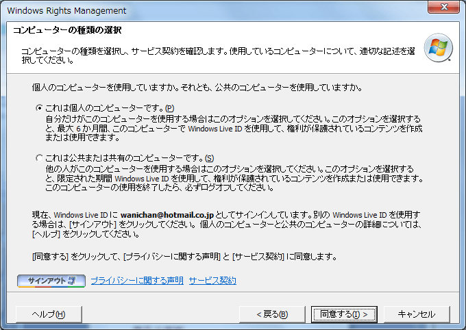- コンピューターの種類の選択画面が表示されたら、個人のコンピューターか、公共または共有のコンピューターかいずれかを選択して[同意する]ボタンをクリックします。