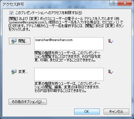 - [アクセス許可]ダイアログボックスで、[このプレゼンテーションへのアクセスを制限する]にチェックをつけます。