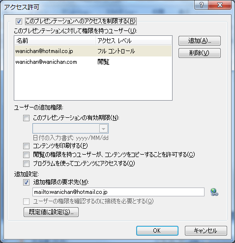 - 閲覧や変更を許可する電子メールアドレスを入力して[OK]ボタンをクリックします。
