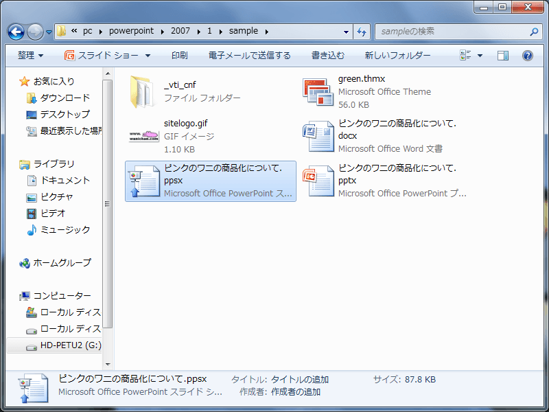 PowerPoint 2007での既定のファイル形式は、拡張子 .pptx となりますが、基本的にPowerPoint 2003以前では開くことができません。ファイルのダブルクリックでスライドショーを実行するように保存、PowerPoint 2003でも開けるように互換性のファイル形式で保存、および、PDFファイルに変換する方法について説明します。