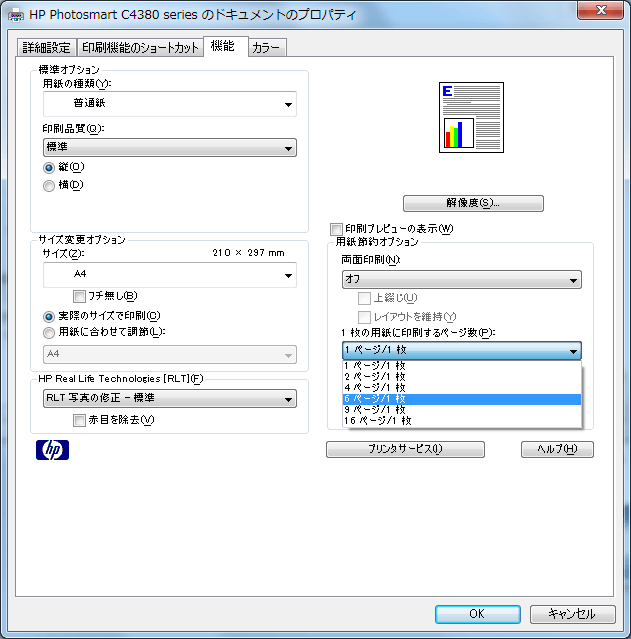 - プリンタのプロパティの1枚の用紙に印刷するページ数を指定します。