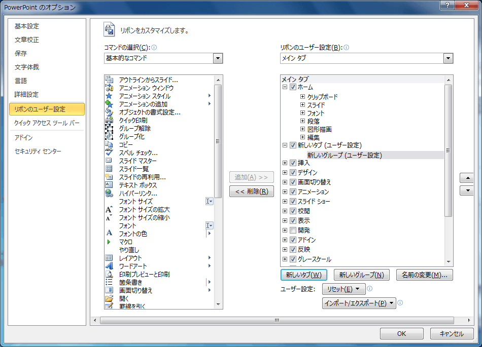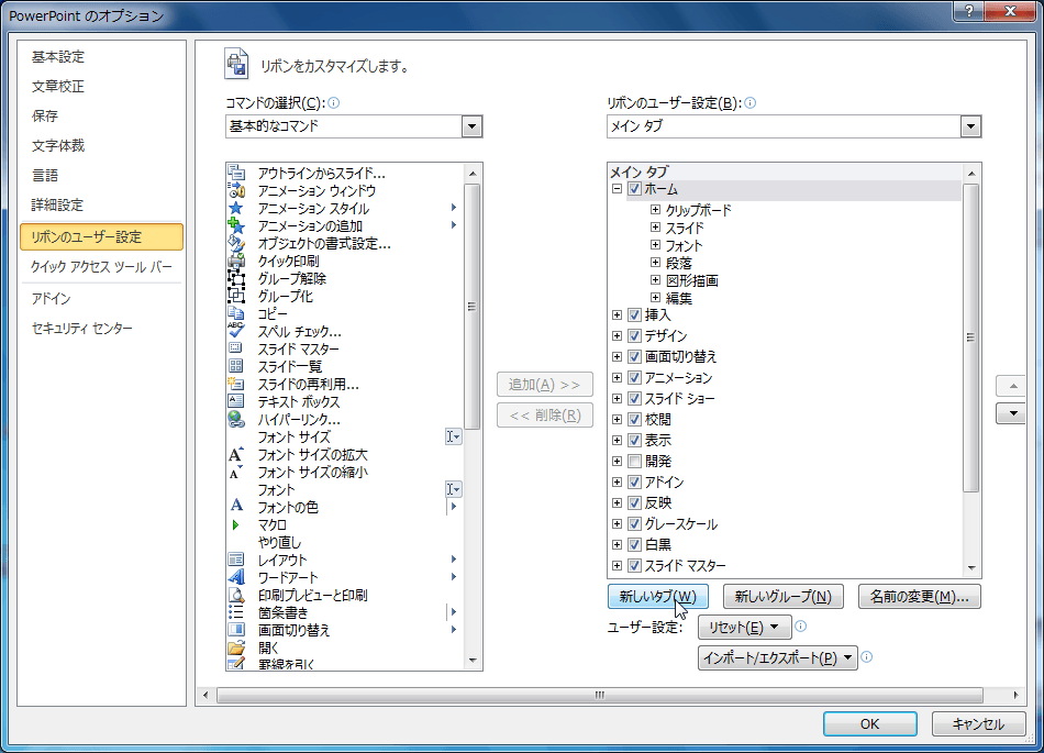 - [PowerPointのオプション]ダイアログボックスの[リボンのユーザー設定]を開きます。