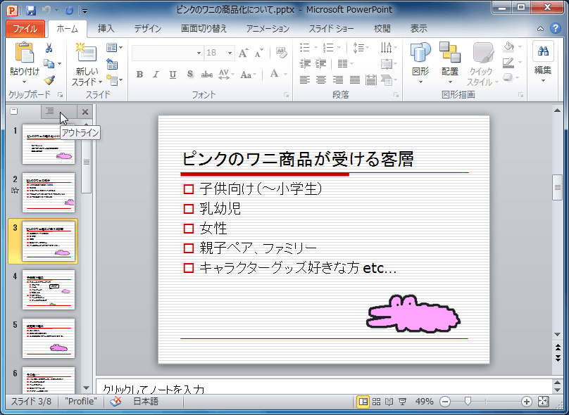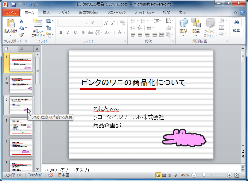 PowerPoint 2010既定では、プレゼンテーションの表示は[標準]が選択され、左側にスライドのサムネイルが表示されます。表示したいスライドのサムネイルを選択することで、プレゼンテーションを移動できます。