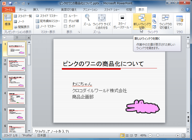 PowerPoint 2010で作業中のプレゼンテーションが表示された新しいウィンドウを開くには、[表示]タブを開き、[ウィンドウ]グループの[新しいウィンドウを開く]をクリックします。新しいウィンドウを開いたら、タイトルバーのファイル名の後に「:1」や「:2」が付加されます。