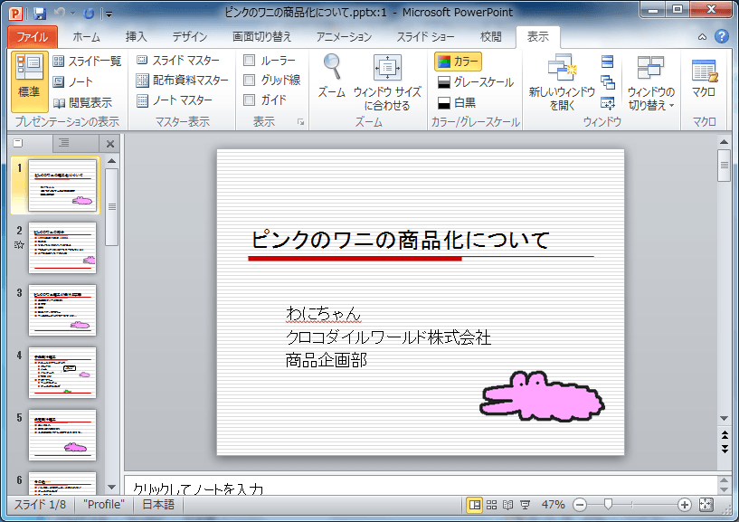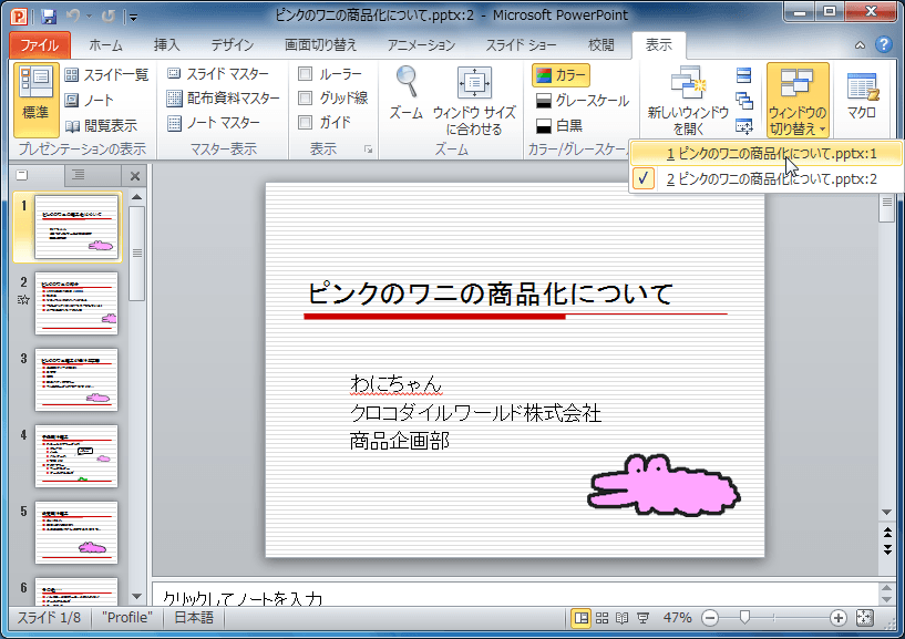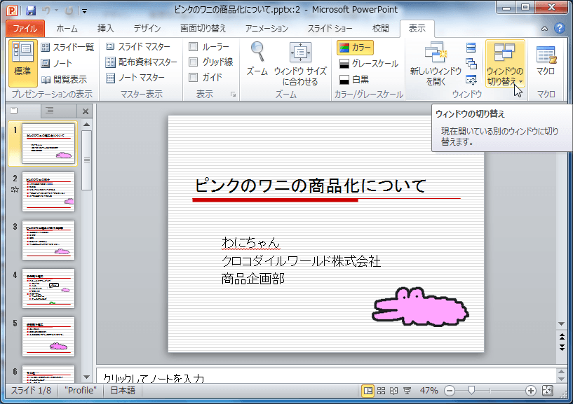 PowerPoint 2010で複数のPowerPointのウィンドウを同時に開いていて、現在開いている別のウィンドウに切り替えるには[表示]タブを開き、[ウィンドウ]メニューの[ウィンドウの切り替え]をクリックして、切り替えたいウィンドウを選択します。