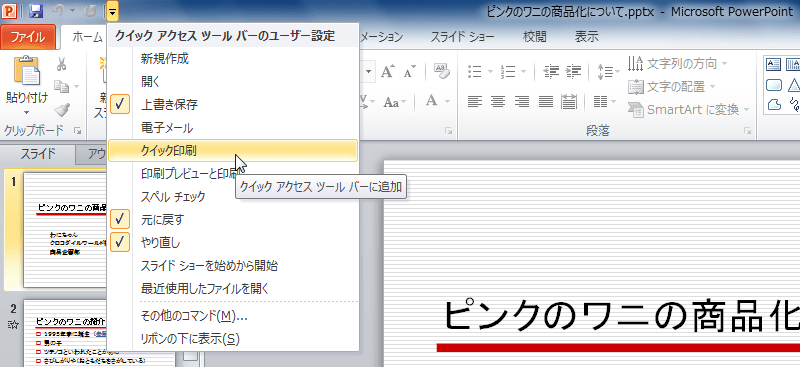 - 表示したいコマンドボタンをクリックします。ここでは、[クイック印刷]を選択します。